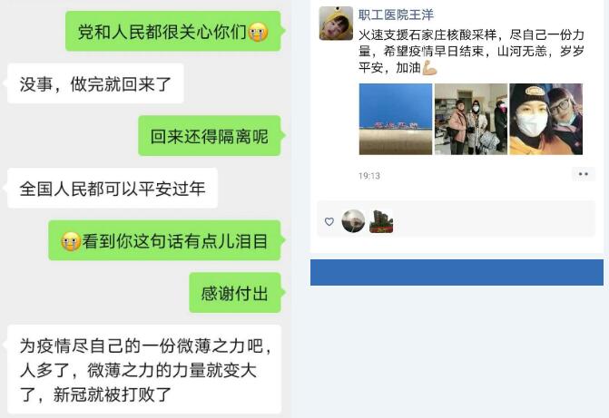 陳思宇是一名職工醫院的護士,團支部書(shū)記,同時(shí)也是共產(chǎn)黨員,業(yè)務(wù)能力強,責任心強,接到通知后,她表示堅決服從組織安排?!?span id="pl7d77l" class="highlight">唯一有些顧慮的就是孩子還小,從來(lái)沒(méi)有離開(kāi)過(guò)媽媽。但是家里孩子的奶奶爺爺、姥姥姥爺非常支持,覺(jué)得這是一件非常有意義的事兒,他們一定會(huì )好好照顧孩子,全家人的支持把我的顧慮都解決了。然后我就特別灑脫的坐上了去石家莊支援的車(chē)?!标愃加钚χ?zhù)說(shuō)。